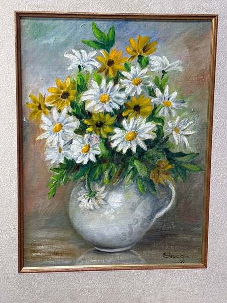Original Painting of Floral Arrangement in White Pitcher; Signed E. Lucas (No Glass)