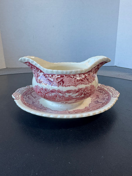 (GG) Mason’s England Vista Pink China Round Gravy Boat with Attached Saucer