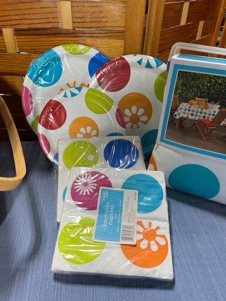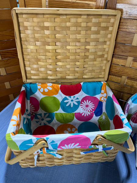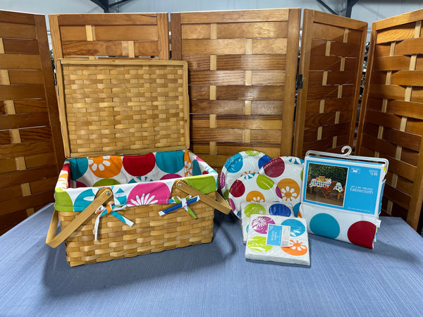 Basket: 16"x12", 9"H. All paper prioducts in plastic/appear new