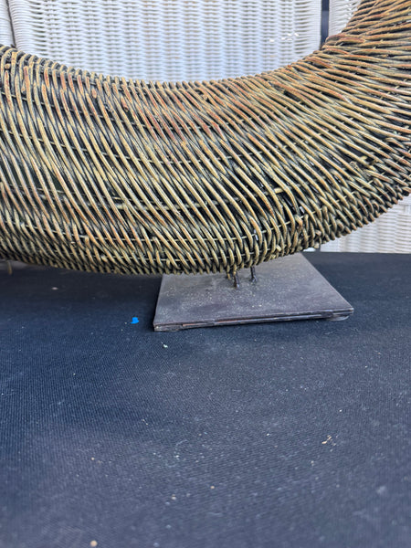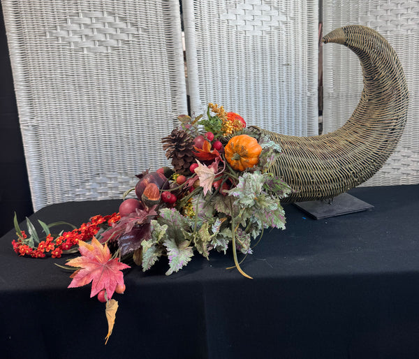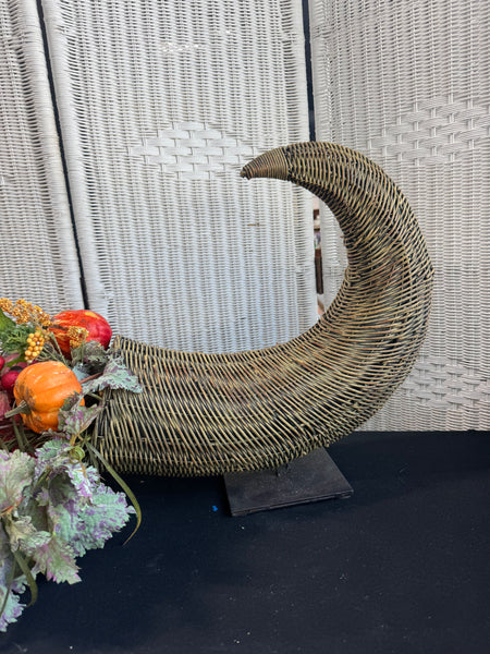 Large Faux Floral Wicker Woven Cornucopia on Stand