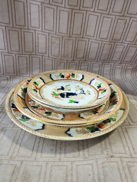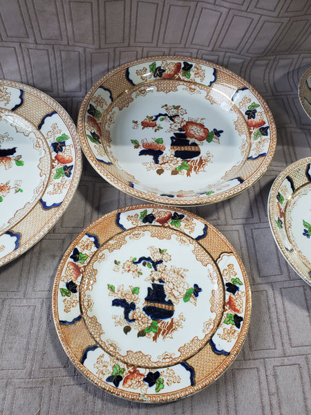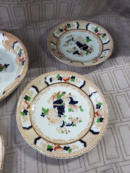 Pieces have crazing: see photos/1 Salad Plate: 9"D/1 Soup Bowl: 7.75"D×1.5"H/1 Bread Plate: 6"D/2 Fruit Bowls: 6"D×1"H