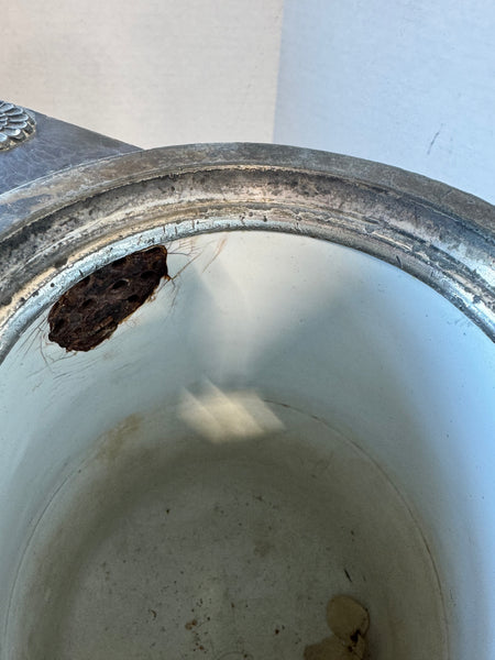 DETAILS: Lots of imperfections overall and large rusted hole on interior porcelain liner—see photos.