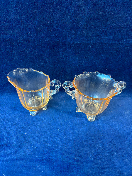 Cambridge Martha Style Cream & Sugar Set Footed W Scroll Handles Amber Glass