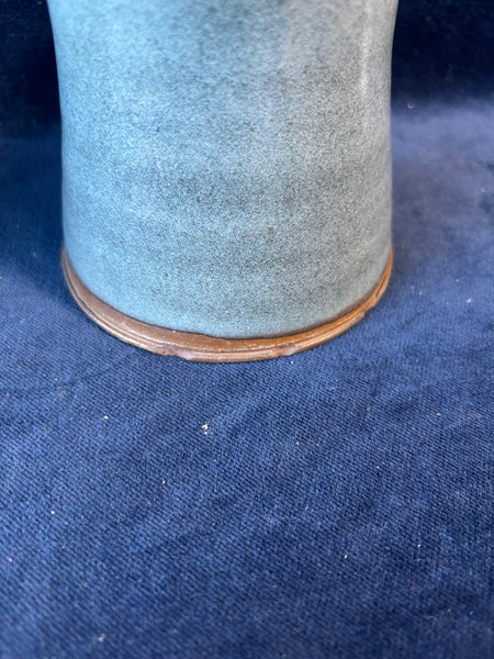 Approximately 4” H x 3” D / blue mug has chips on bottom base