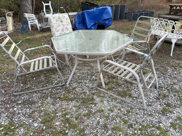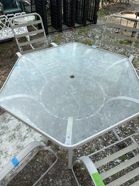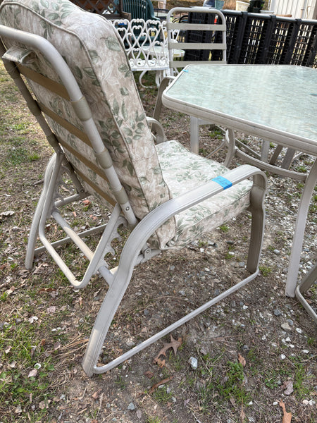 Aluminum Outdoor Dining Table w/Glass Top and Four Chairs (Only One Cushion)