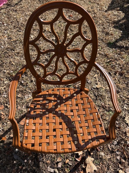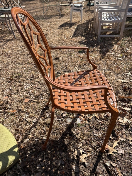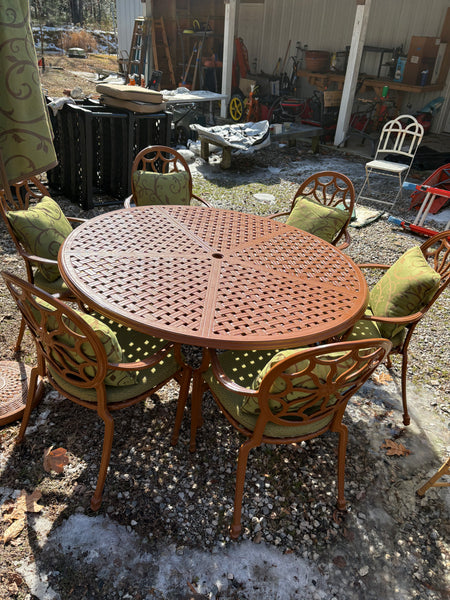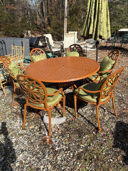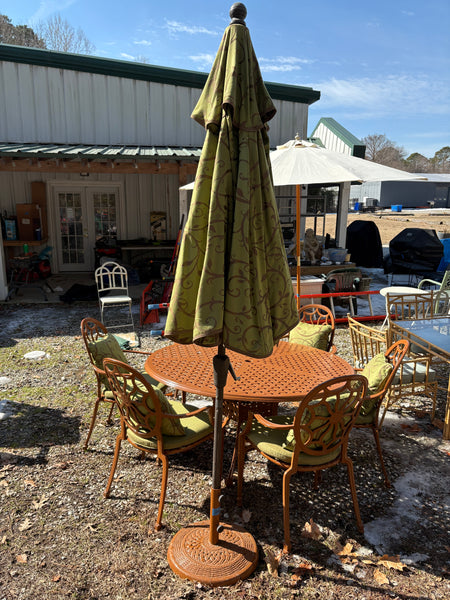 Cast Aluminum Painted Basket Weave Outdoor Table and Chair Set w/Custom Cushions, Umbrella and Stand