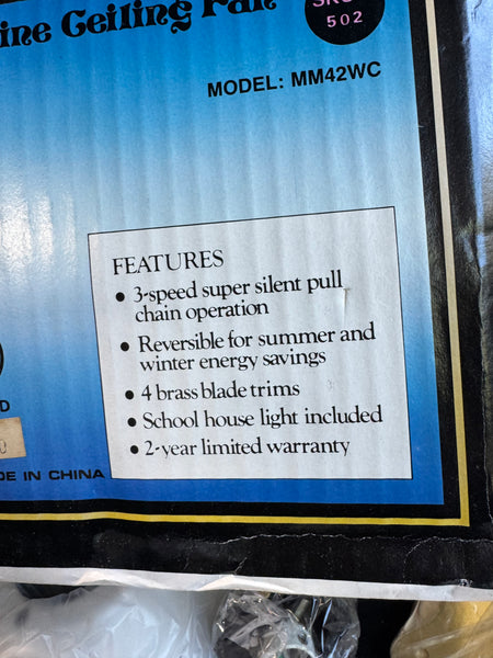 DETAILS: Model MM42WC. Open box—all pieces appear included and unused—fan blades are sealed. Some assembly required.