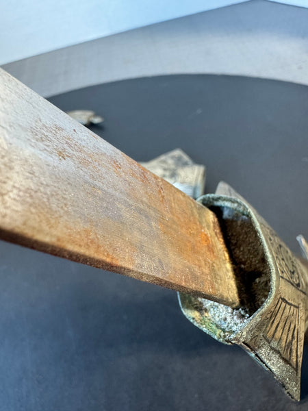 DETAILS: Shows wear overall, blade has some rust and metal has patina where blade enters sheath—see photos.