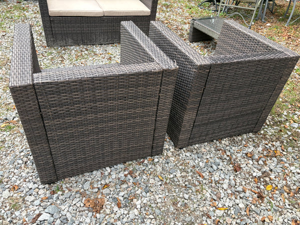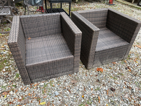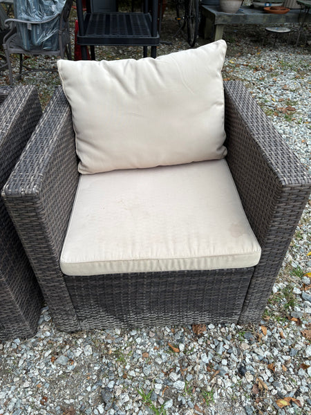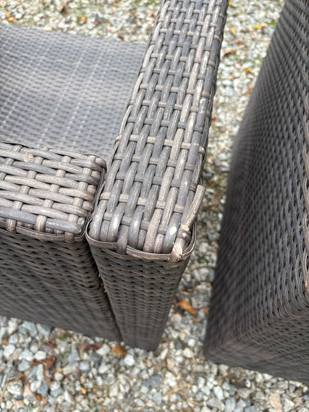 Loveseat, 25” x 28” x 29.  Seat height, 14 inches. The wicker is in good condition, the cushions show some wheat. Please see photos.