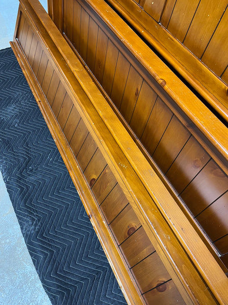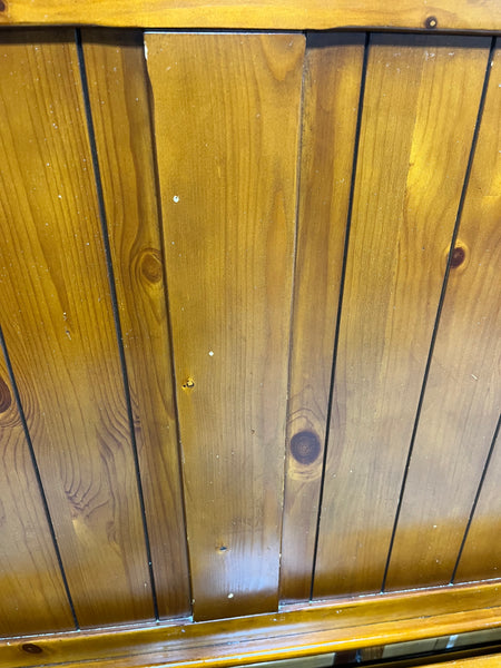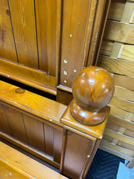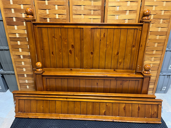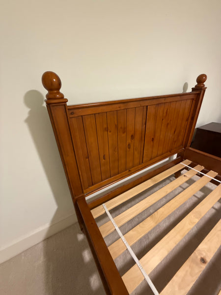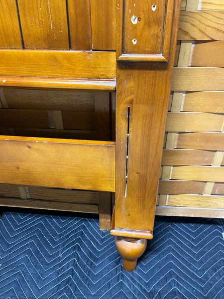 Headboard: 60"W x 54"H. Width slat to slat measures 56". Comes with side rails and slats. Bed shows age/wear; imperfections - see photos.