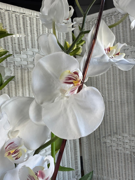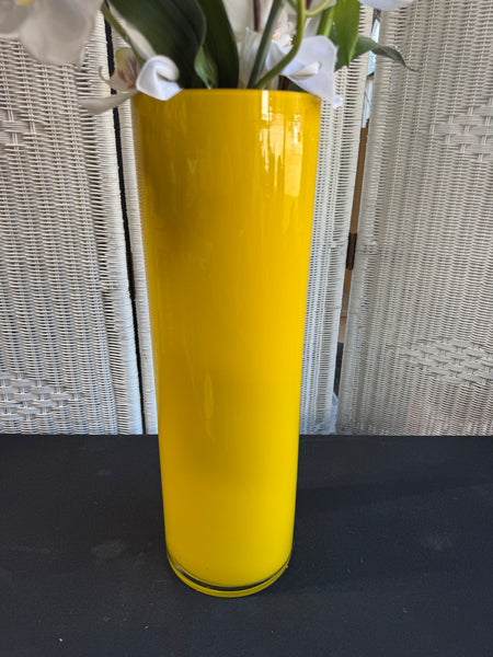 Faux White Orchids in Yellow Glass Cylindrical Vase