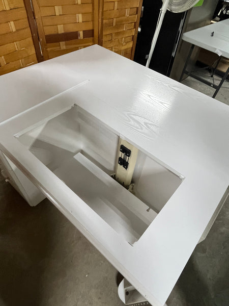 48"x20", 29 1/2"H. Drop side adds another 20" of table top space. Hydraulic lift to raise and lower sewing machine. Variety of configurations-see photos. Picture of similar item shown for comparison.