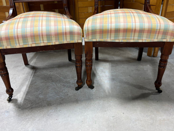 Pair of Antique Chairs with Front Casters and Plaid Fabric
